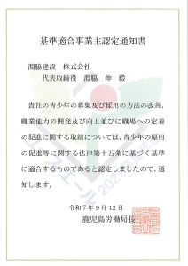 この度、淵脇建設株式は鹿児島労働局より 「ユースエール」の認定を受けました!! 「ユースエール」認定とは ~若者の採用・育成~「ユースエール認定」とは、青少年の雇用の促進等に関する法律(若者雇用促進法)に基づく認定制度で […]
